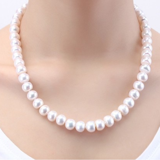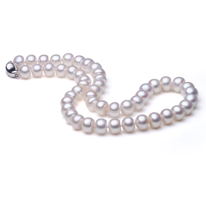 Deze prachtige parelketting is gemaakt van zogenoemde broodvormige 10-11 mm grote witte zoetwaterparels.